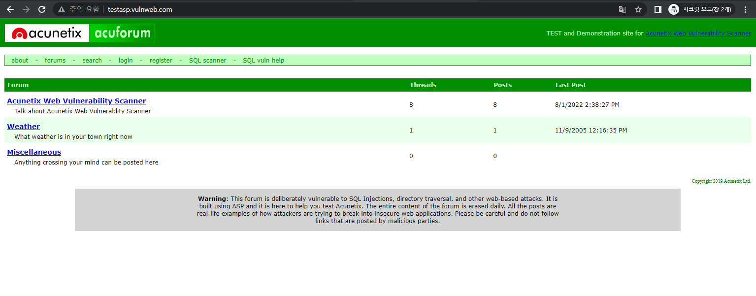 Forums의 Acunetix Web Vulnerability Scanner, Weather, Miscellaneous에서 SQL 인젝션에 가장 적합한 페이지 입니다 .